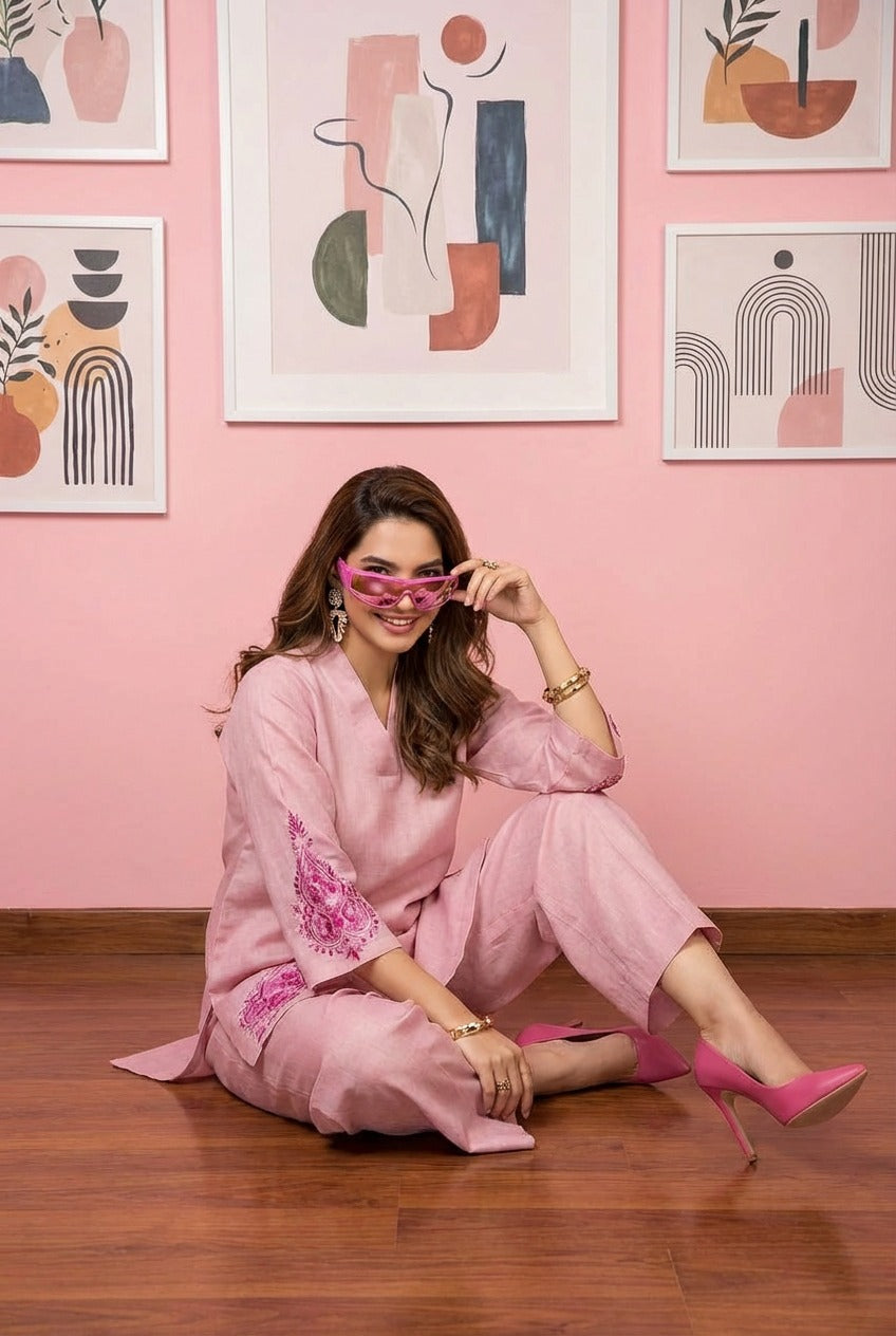 100% Lawn Pink Cord Set – Hand Embroidered Elegance